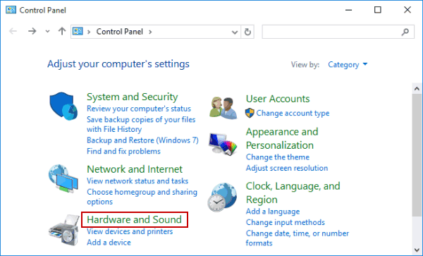 - Now, go to the Control Panel and tap on Hardware and Sound.
