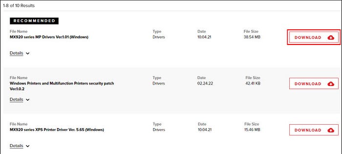 - Once a list of various Canon printer driver options appears on the display, select the driver and click on Download.